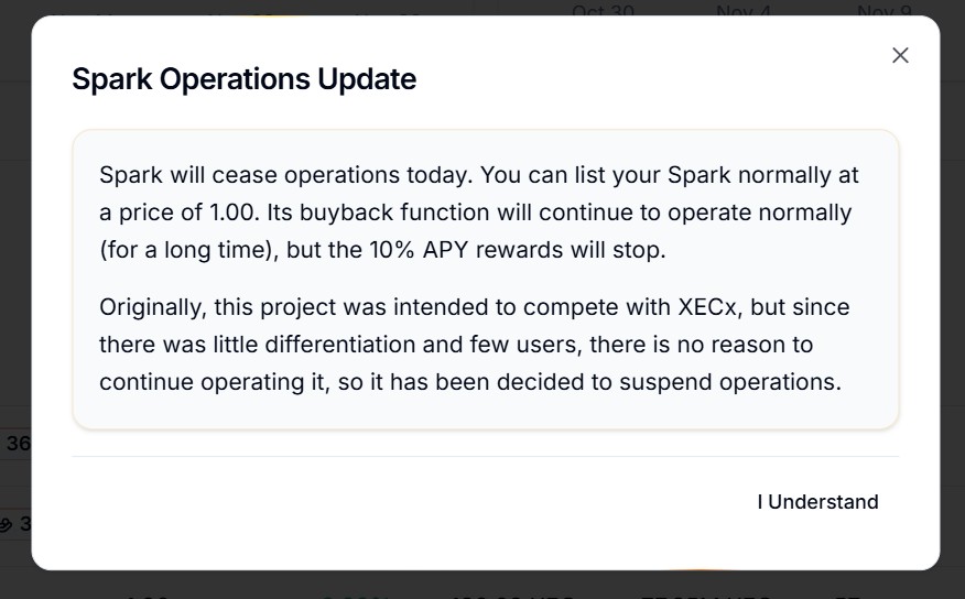2025-11-26 12:53:32 (UTC-8) Update: Spark announced the cessation of its operations. This marks the discontinuation of agora.cash‘s only non-defaulted project, bringing agora.cash’s token default rate to 100%.