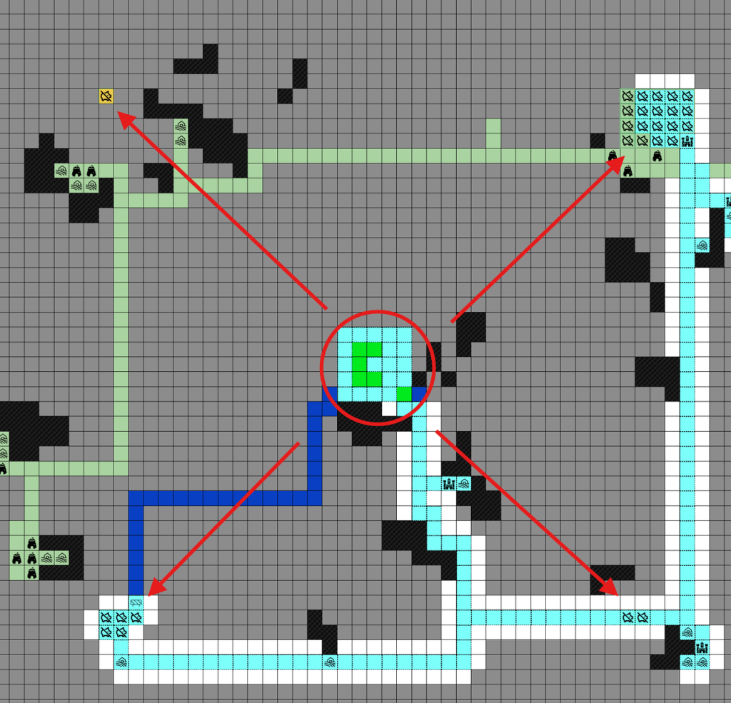 The route from your spawn point to resource spots is dangerous. Specifically, the resource point at the 2 o’clock direction is the richest—and thus the route to it is also the most hazardous. Establishing your sphere of influence here will block others’ paths.